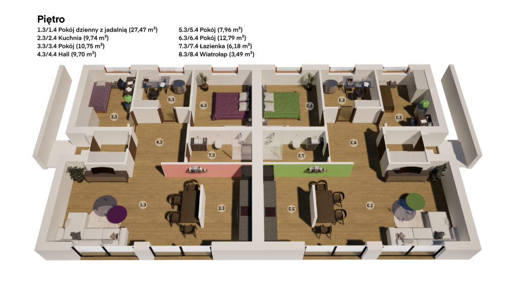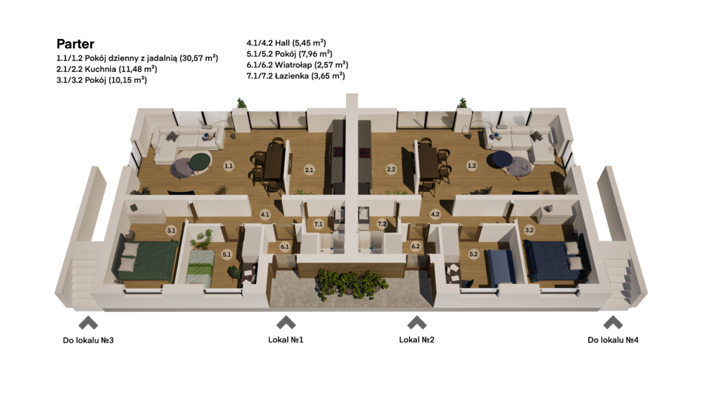 Ten nowoczesny dwulokalowy budynek, przeznaczony do zabudowy bliźniaczej, oferuje 4 wygodne mieszkania z niezależnymi wejściami. Dwa wejścia do mieszkań na parterze zlokalizowane są we frontowej części budynku, natomiast dwa górne mają dostęp z boku obiektu. Taki rozkład istotnie podnosi komfort i prywatność każdego z apartamentów. Nowoczesna bryła oraz doskonały układ funkcjonalny sprawiają, że projekt cieszy się zainteresowaniem nawet najbardziej wymagających klientów.