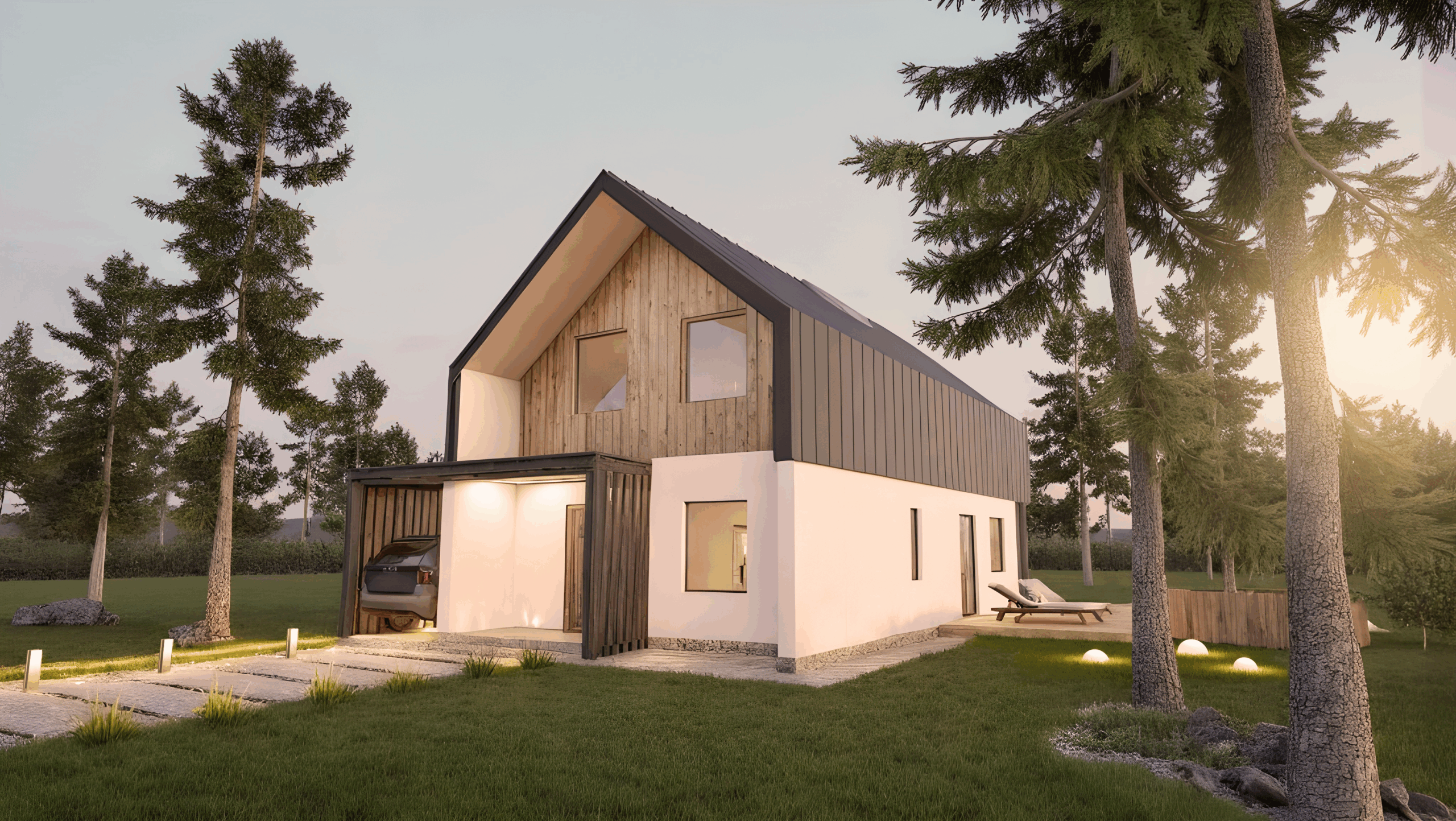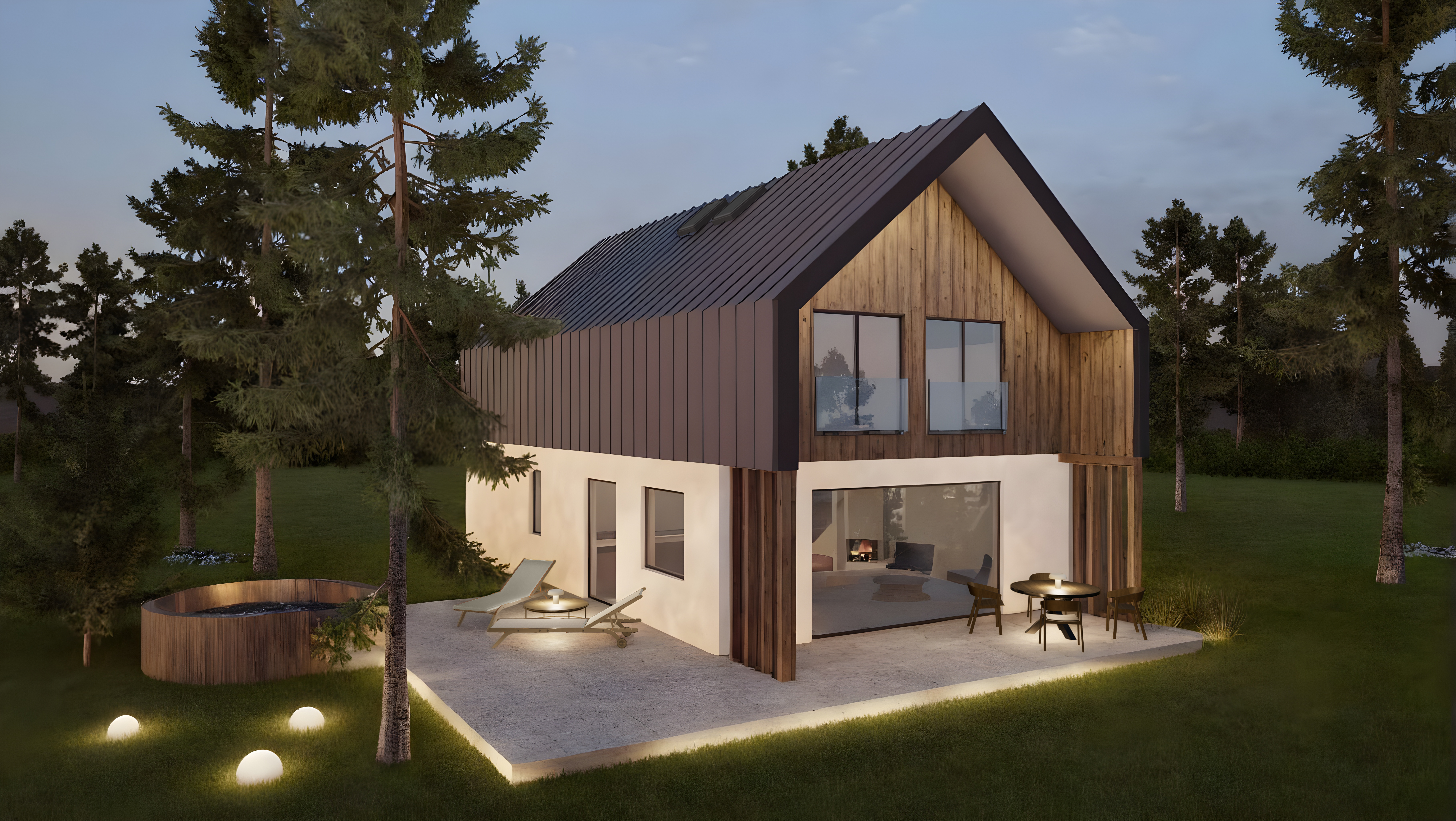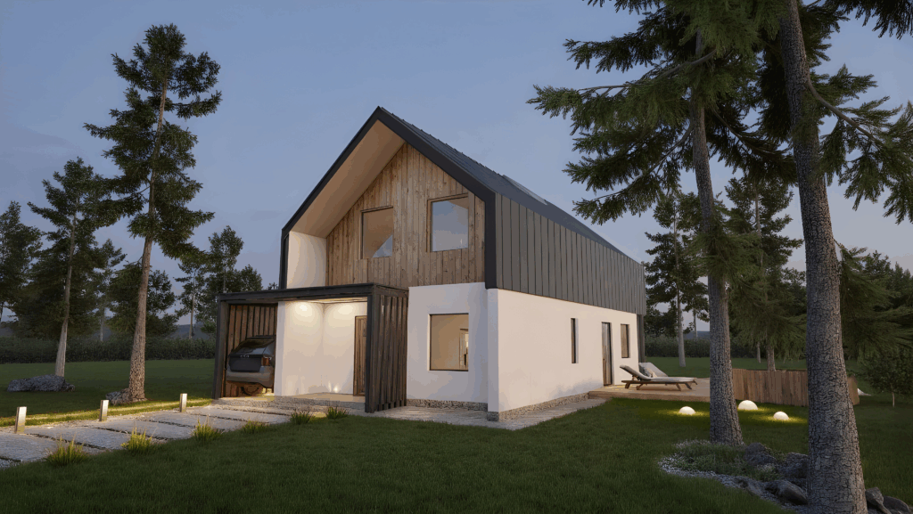 Koncepcja z wykorzystaniem blachy na rąbek oraz drzewna. Widoki wieczorne