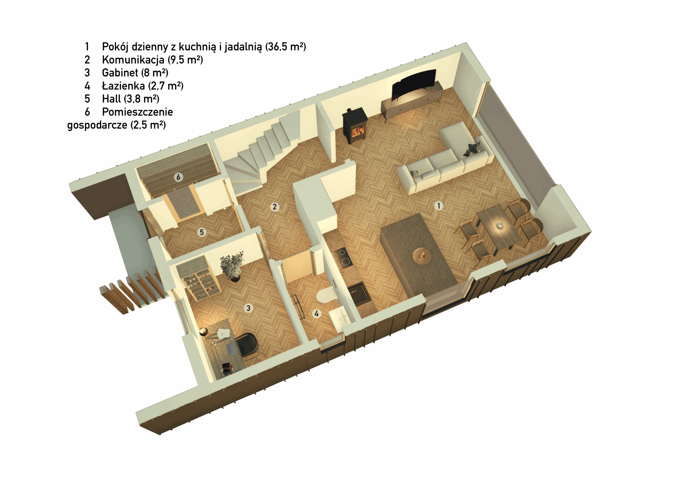 Łazienka dla gości (2,7 m²), praktyczne pomieszczenie pralni (2,5 m²) oraz przemyślana komunikacja (13,3 m²) – wszystkie funkcje pomocnicze umieściliśmy tak, aby dom po prostu dobrze działał na co dzień.