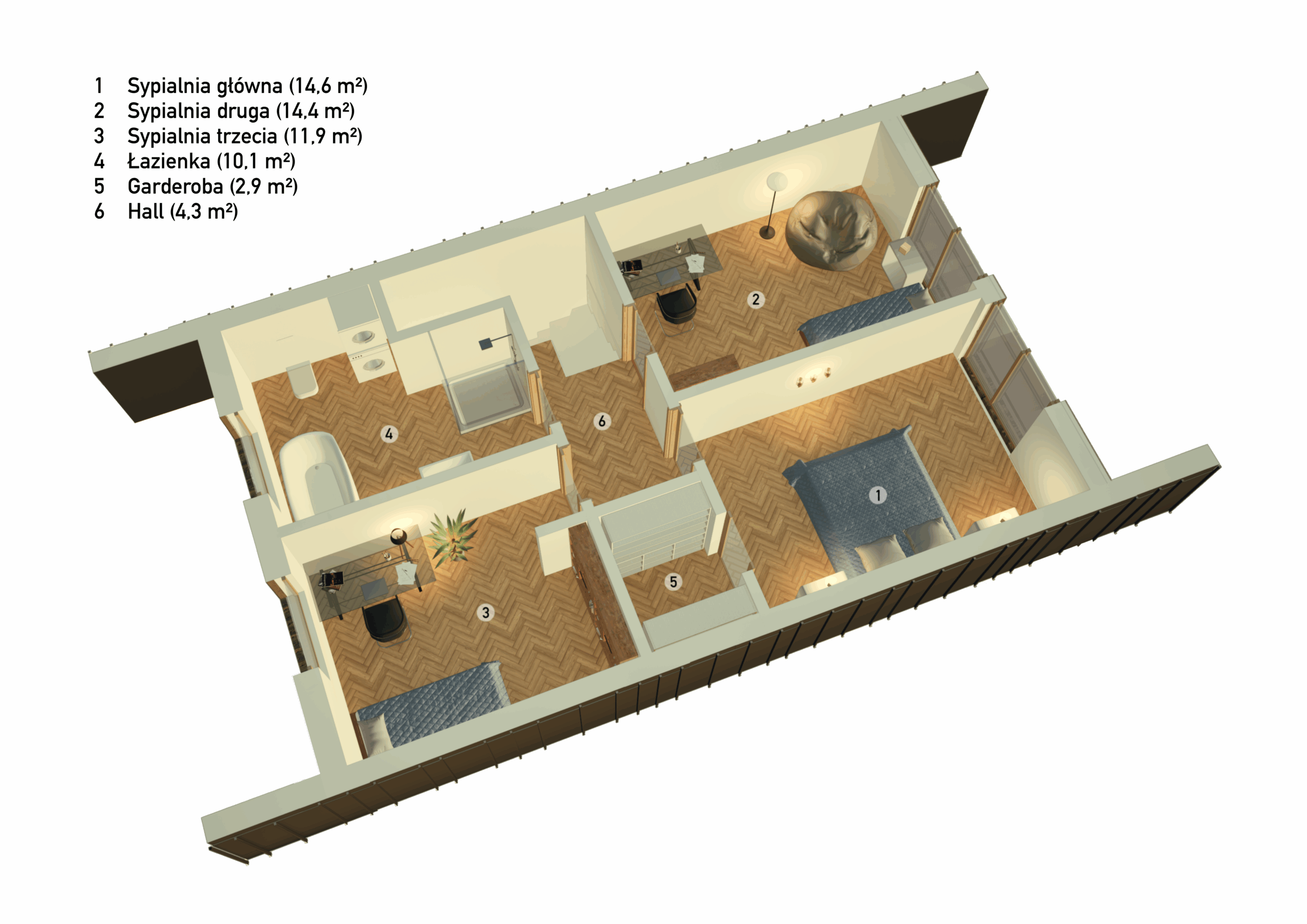 Trzy przestronne sypialnie – 14,6 m² | 14,4 m² | 11,9 m²