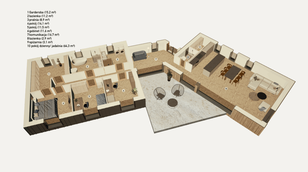 Jedno ze skrzydeł przeznaczono na część prywatną. To tutaj życie zwalnia tempo. Sypialnia właścicieli (14,1 m²) z dużą garderobą (15,2 m²) tworzy osobistą strefę relaksu, a obok znalazło się miejsce na pokój dziecka (11,5 m²) i gabinet (11,6 m²), który w razie potrzeby może pełnić rolę dodatkowej sypialni lub przestrzeni do pracy zdalnej. Komfort uzupełnia funkcjonalna łazienka (11,2 m²) oraz pomieszczenie gospodarcze (8,9 m²), sprawiające, że codzienność staje się wygodniejsza i bardziej uporządkowana.