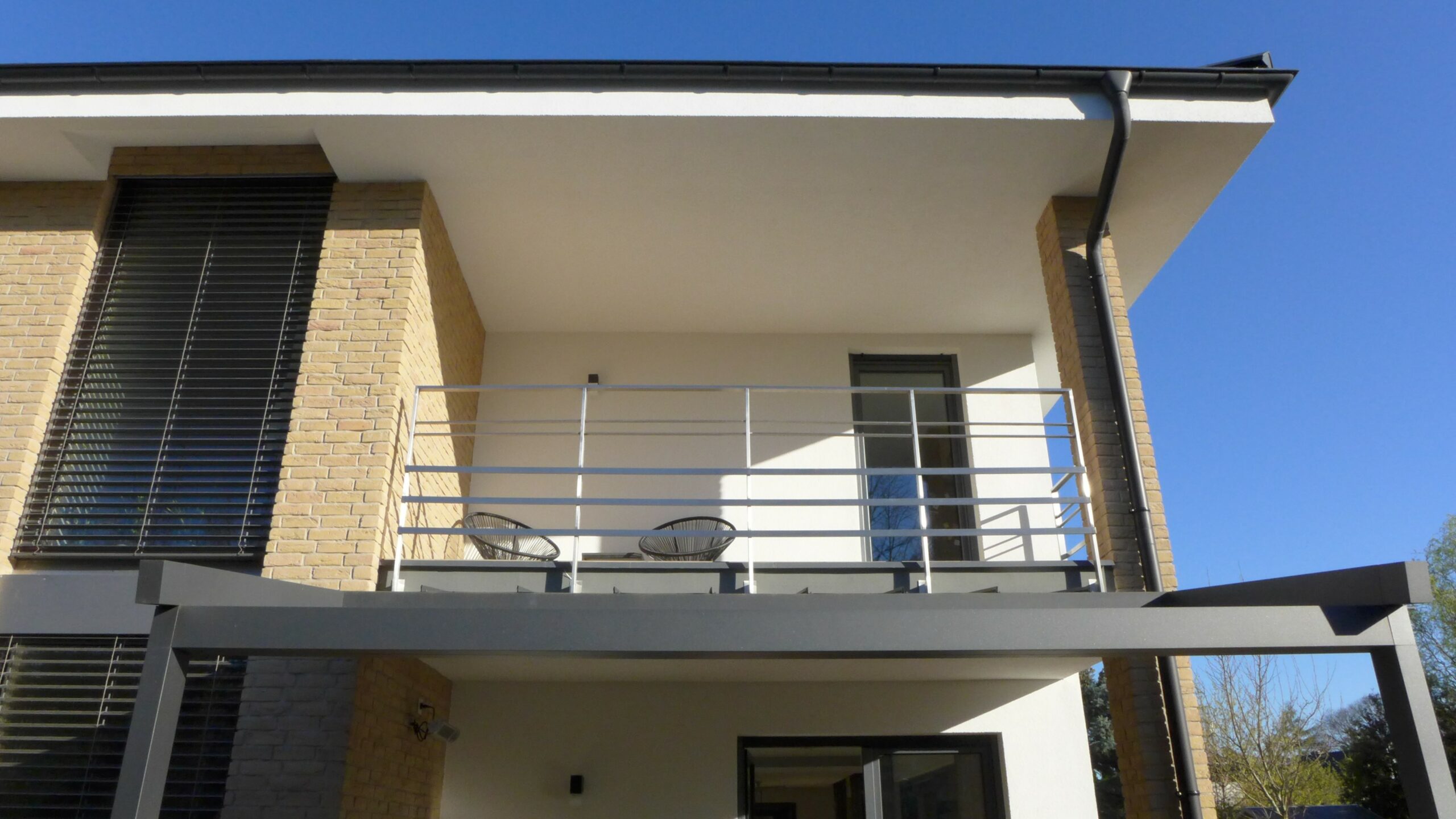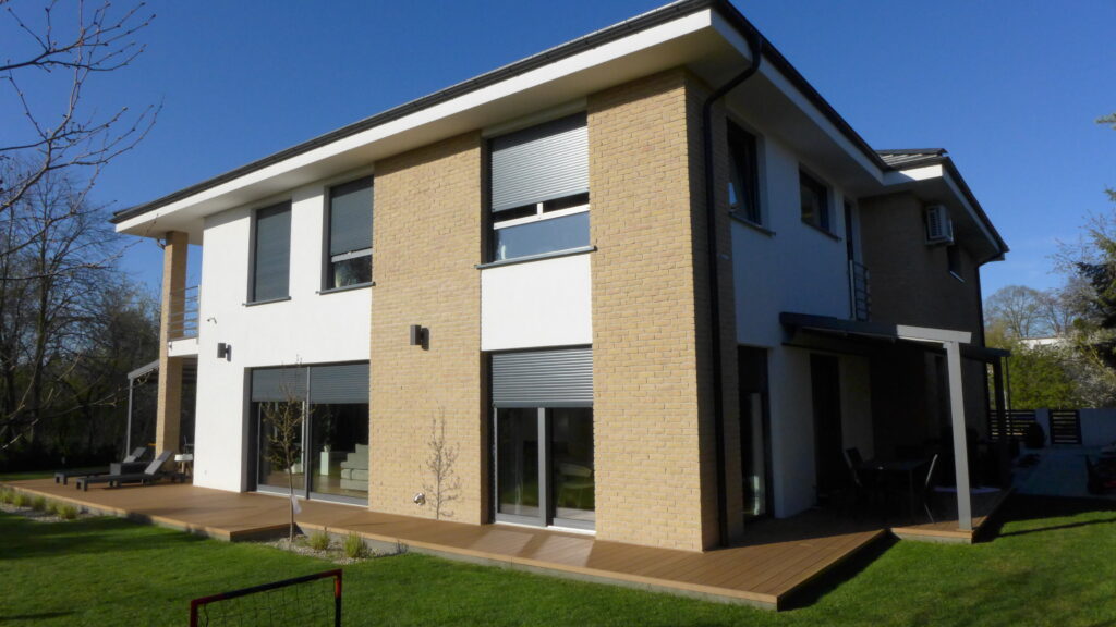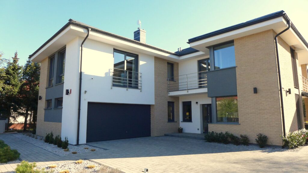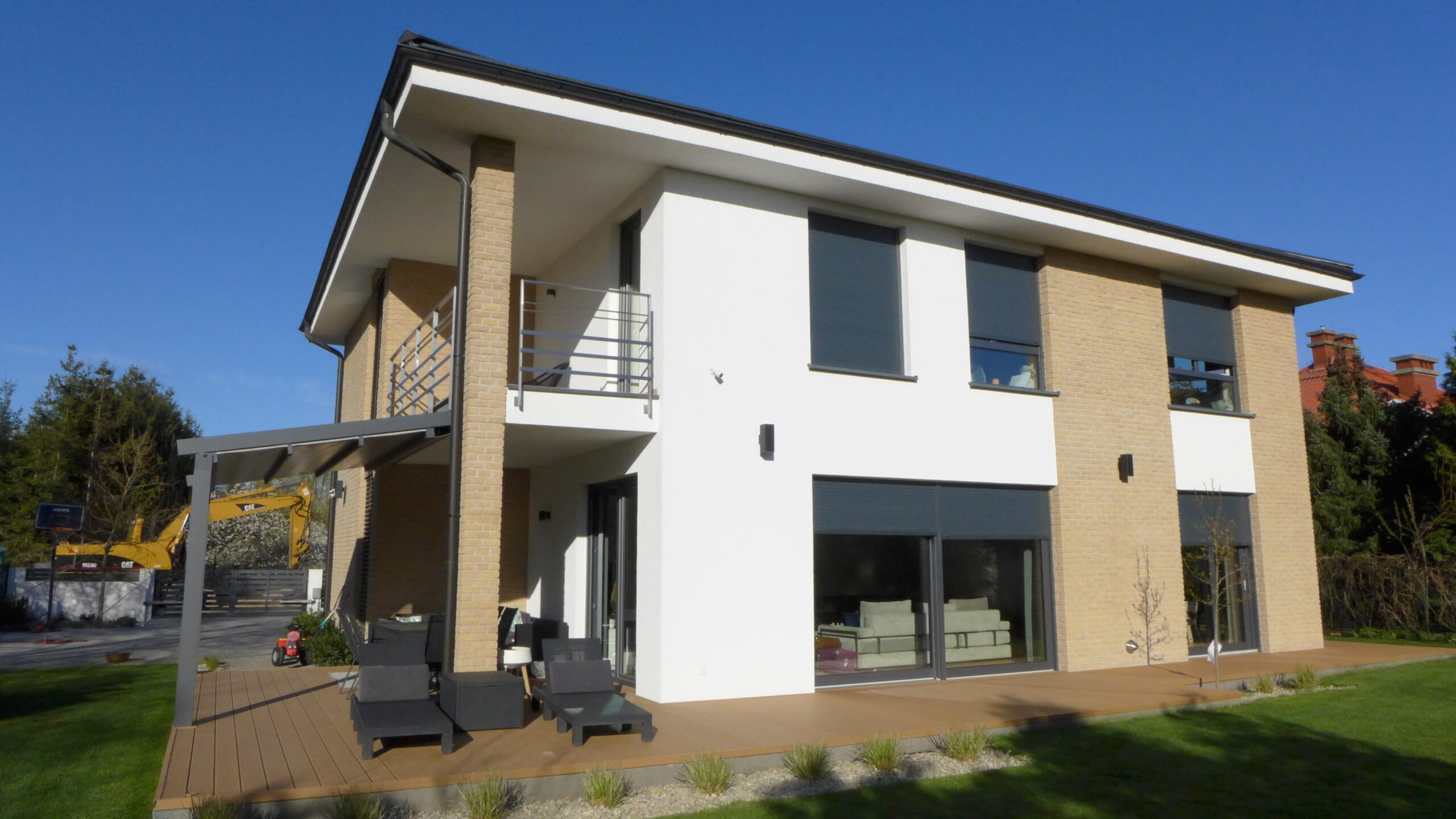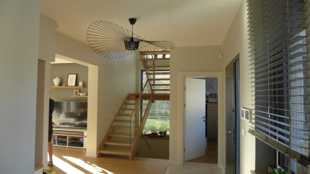 Na piętrze znajduje się wydzielona strefa małżeńska z sypialnią, garderobą oraz prywatną łazienką. Ponadto, na tej kondygnacji umieszczono dwie obszerne sypialnie dla dzieci, łazienkę, pralnię z suszarnią oraz pomieszczenie fitness.