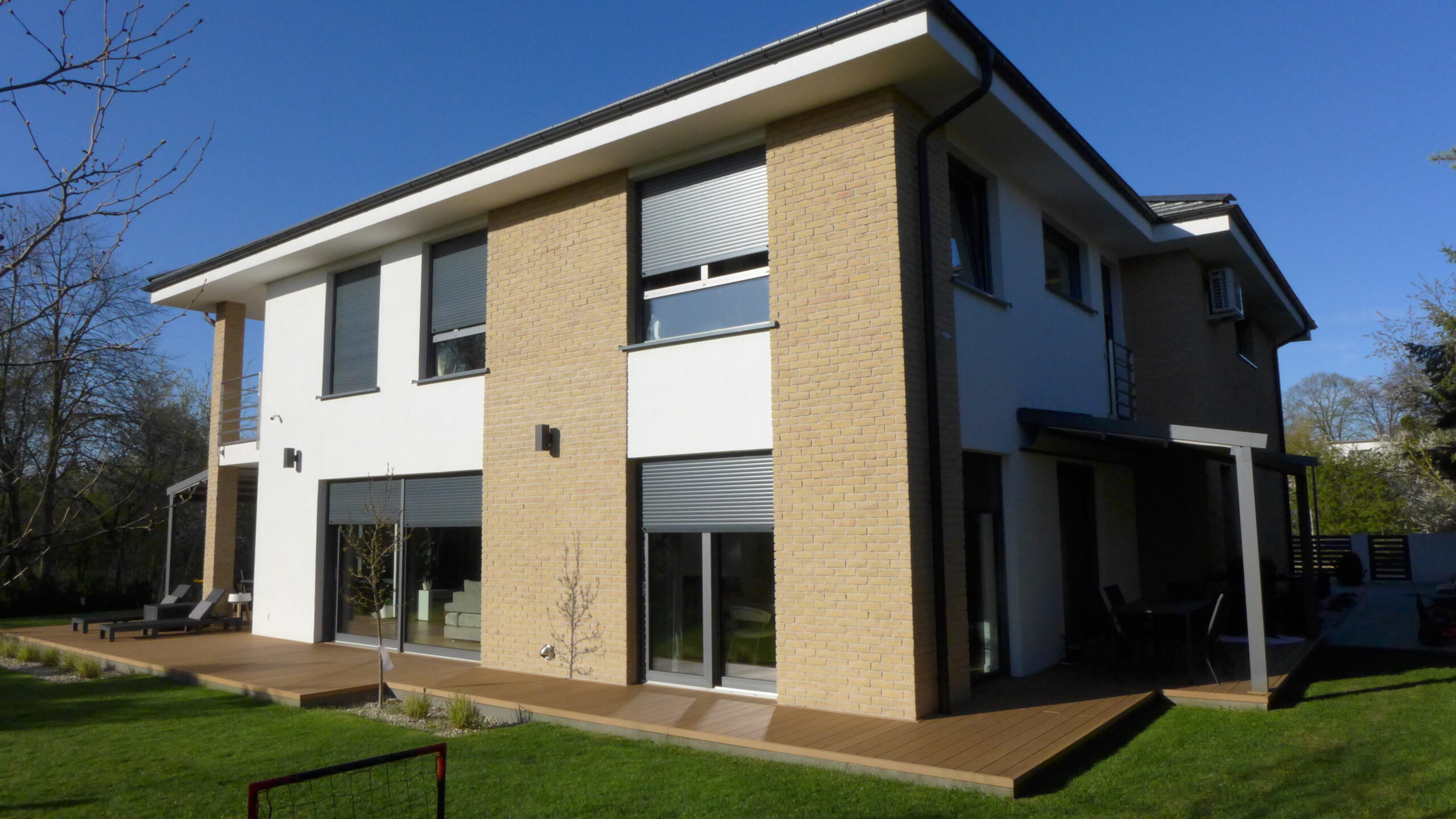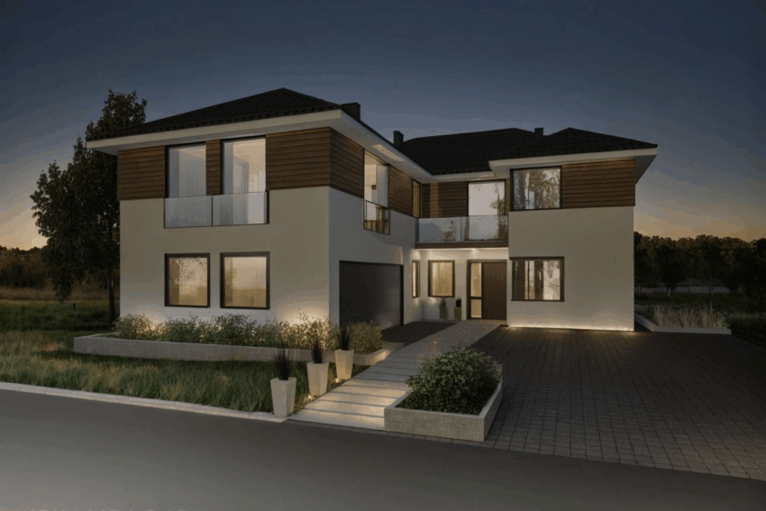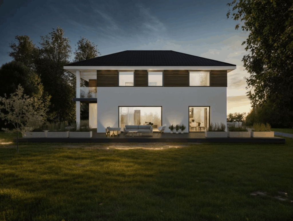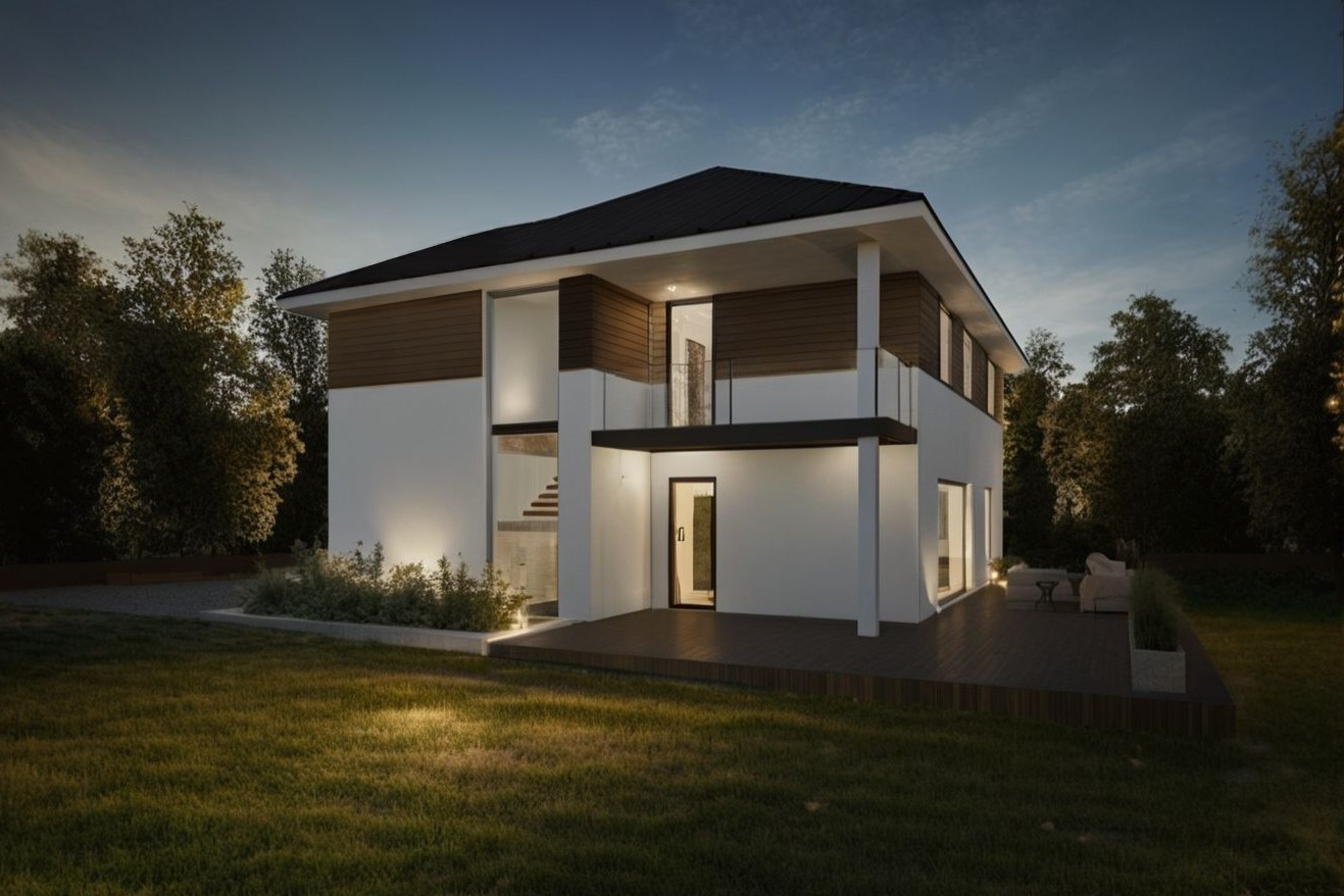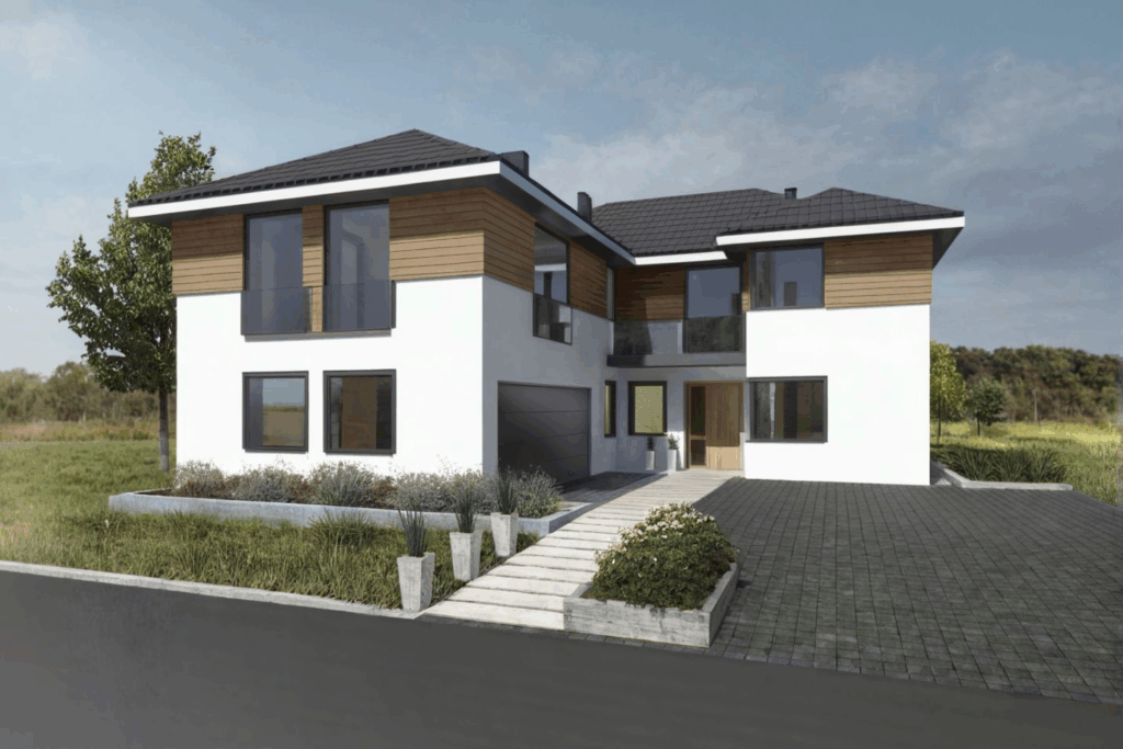 Prezentujemy komfortowy dom dedykowany dla rodziny 4-5 osobowej. Bryła budynku, utrzymana w prostych i proporcjonalnych formach, sprawnie łączy niewielką powierzchnię z funkcjonalnym układem przestrzennym. Istotnym elementem jest duże przeszklenie klatki schodowej, wprowadzające światło dziennie i podkreślające harmonię projektu.