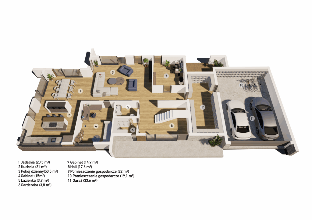 - Garaż (33,6 m²) – wygodna przestrzeń dla dwóch samochodów z bezpośrednim wejściem do domu