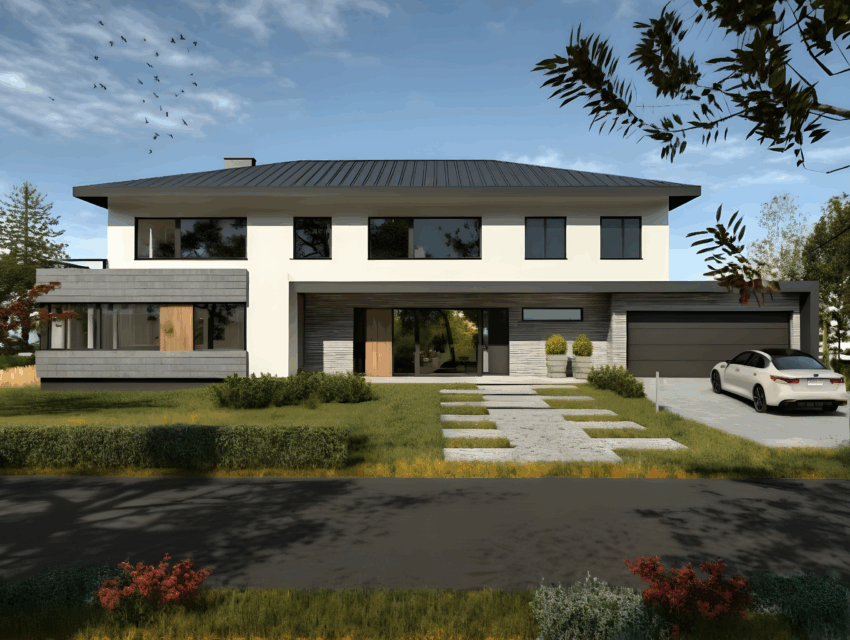 Nowoczesny dom jednorodzinny zaprojektowany z myślą o czteroosobowej rodzinie, łączący funkcjonalność z minimalistyczną estetyką. Bryła budynku charakteryzuje się prostą, horyzontalną kompozycją, która harmonijnie wpisuje się w podmiejski krajobraz, nie dominując nad otoczeniem, lecz tworząc z nim spójną całość.