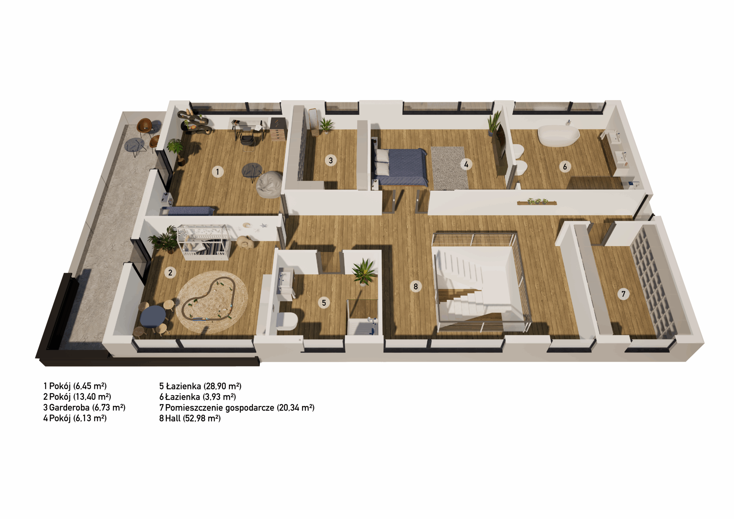 - Hall (52,98 m²) – nietypowo przestronny hall piętra pełni funkcję znacznie wykraczającą poza komunikację. To dodatkowa strefa wypoczynku, miejsce na domową bibliotekę, kącik do pracy lub zabaw dla dzieci – elastyczna przestrzeń dostosowująca się do zmieniających się potrzeb rodziny