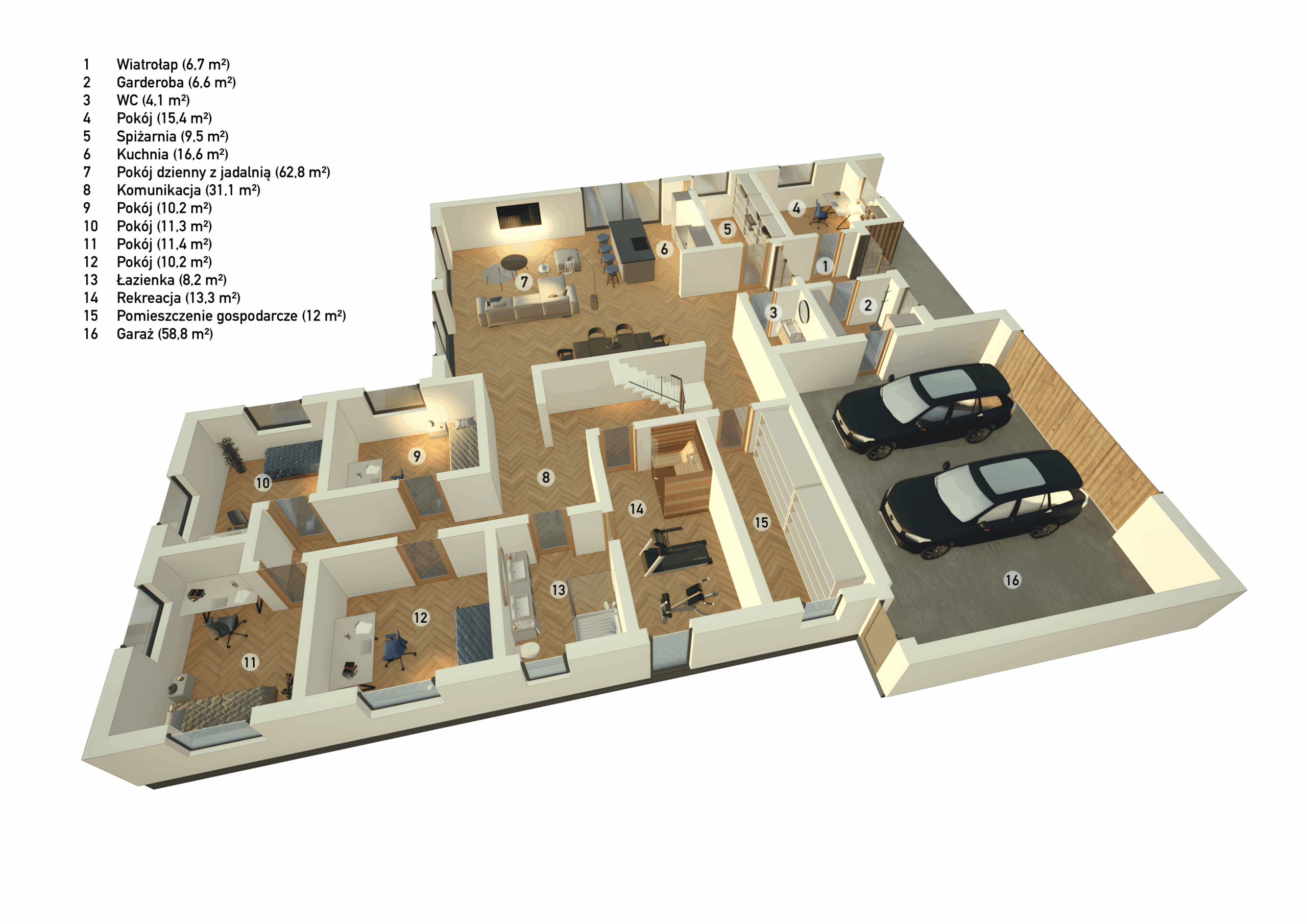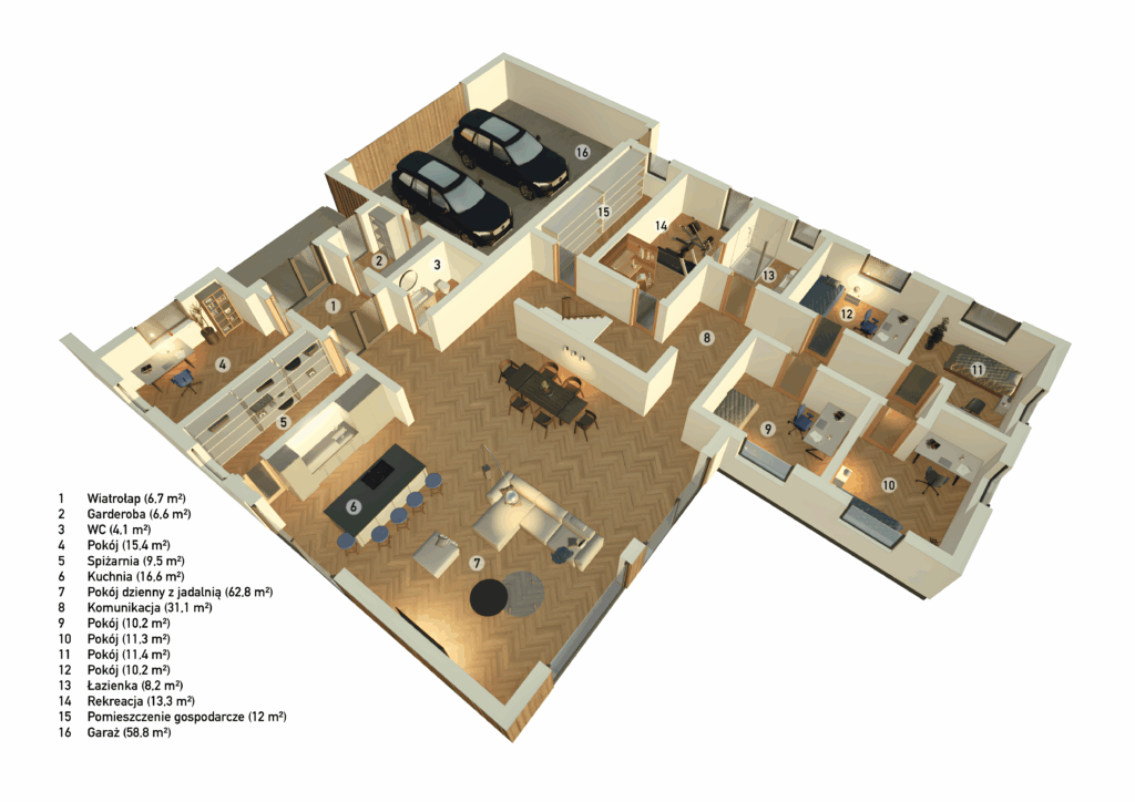 W projekcie znalazł się duży garaż (58,8 m²) oraz funkcjonalne pomieszczenia gospodarcze i garderoby. Przemyślana komunikacja sprawia, że poruszanie się po domu jest naturalne i wygodne.