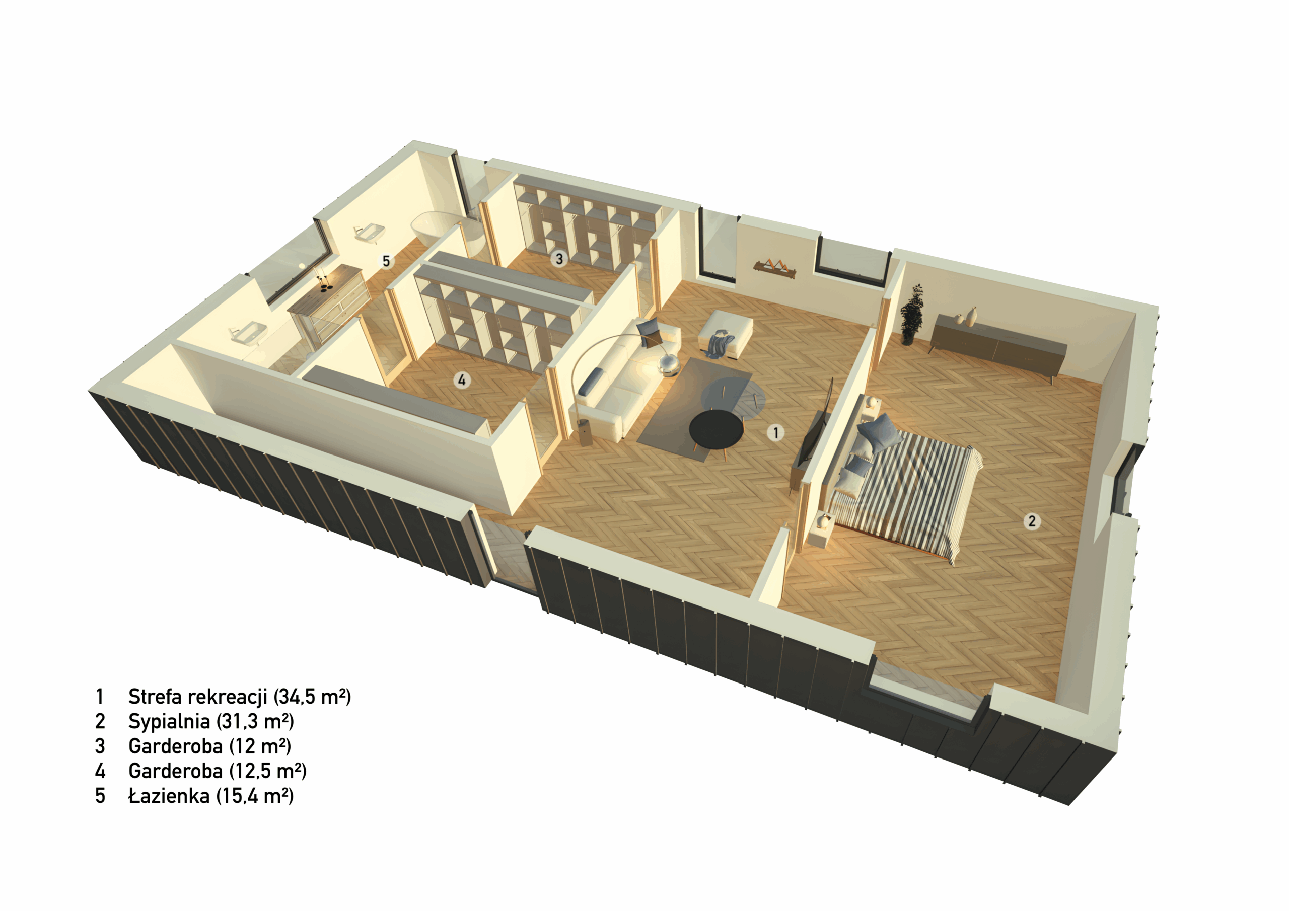 Przestronna sypialnia główna (31,3 m²) to miejsce stworzone specjalnie dla właścicieli domu. Towarzyszą jej dwie niezależne garderoby – (12 m²) i (12,5 m²) – tak, aby każdy z partnerów miał swoją wygodnie zorganizowaną przestrzeń.